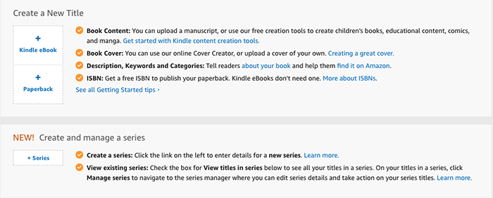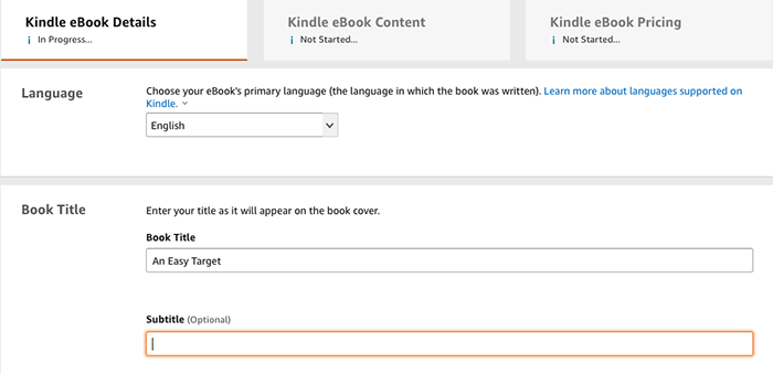 After choosing a Kindle, Paperback, or Series, you will need to fill in a series of three forms. These will be asking everything from your work title to a blurb or description for the Amazon page.