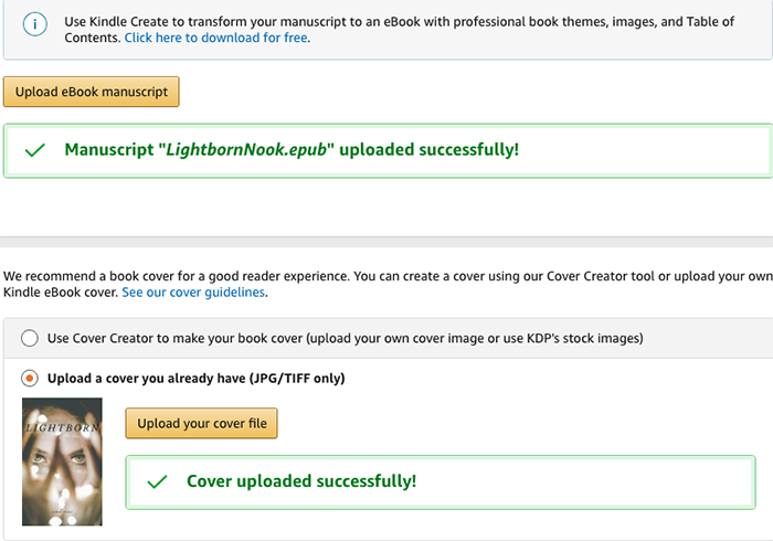 Upload your manuscript and cover art. If you have used Kindle Create, the finished published file can be uploaded directly, and it will be perfectly formatted for ebook distribution. If you choose to upload a PDF instead, be very careful to check each page in the Previewer to ensure nothing has been altered.